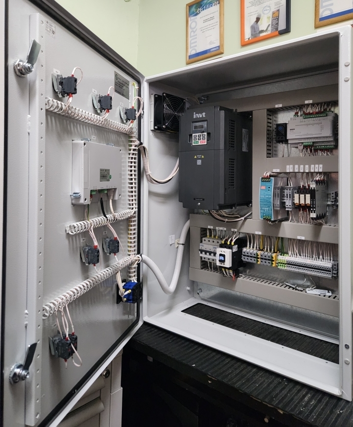 Система Д-Пром-ПЧ4-01ХХХ-0015 реализована на базе преобразователя частоты GD20 (INVT) и программируемого реле Овен ПР103. Для визуализации технологического процесса установлена панель оператора производства «Систем Электрик» (Россия). Основной задачей системы управления является обеспечение безопасности. Для этого в установке используется несколько датчиков температуры, чтобы обеспечить аварийный останов при возникновении угрозы перегрева узлов. Защиту двигателя и механических узлов от перегрузки обеспечивает преобразователь частоты серии GD20 производства INVT (Китай).