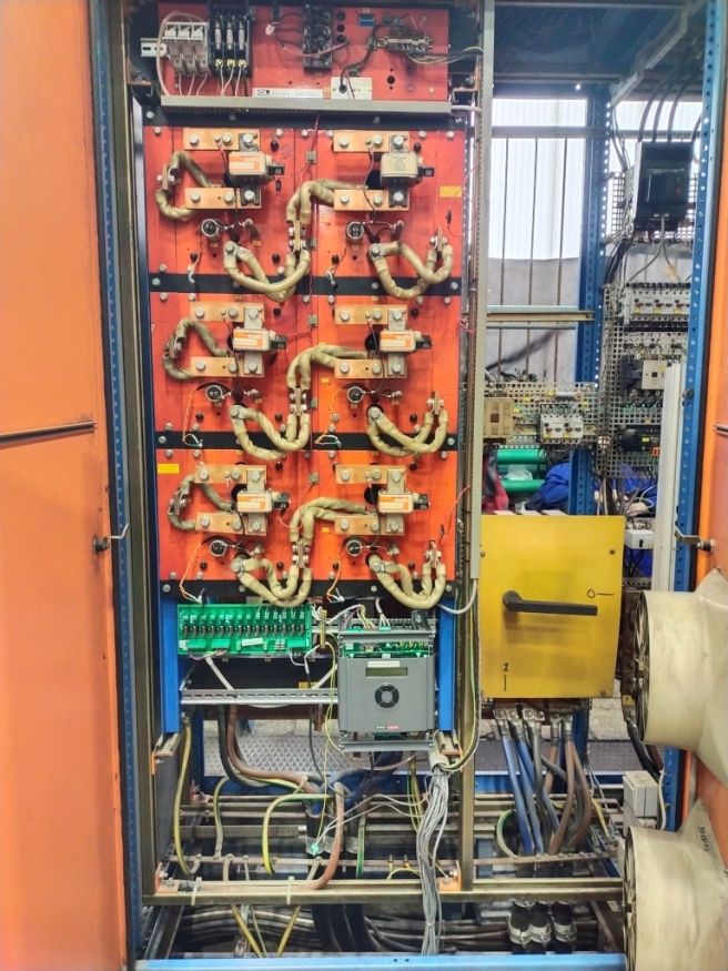 В марте 2024 года специалисты ООО «Драйвика» закончили наладку модуля управления тиристорной сборкой PLXD производства Sprint-Electric (Англия) на приводе постоянного тока прокатного стана. Система управления двигателем постоянного тока имеет уникальную структуру: питание цепи якоря осуществляется от трансформатора с выходным напряжением 530 В, а цепь возбуждения от основной питающей сети 380 В. Ключевым фактором при восстановлении работоспособности было время. Большинство производителей имеют в своей номенклатуре преобразователи с диапазоном питающих напряжений 525-550 В, но они являются нестандартным исполнением. В современных условиях срок поставки такого преобразователя составит около 5-6 месяцев. По этой причине было принято решение о сохранении тиристорного моста на 1000 А со снабберными сборками и цепями защиты. Для экстренных ситуаций на нашем складе постоянно поддерживается ряд преобразователей и модулей управления с дополнительными опциями. Чтобы максимально ускорить процесс восстановления, из наличия был использован модуль управления PLXD с платой импульсных трансформаторов LA102800.